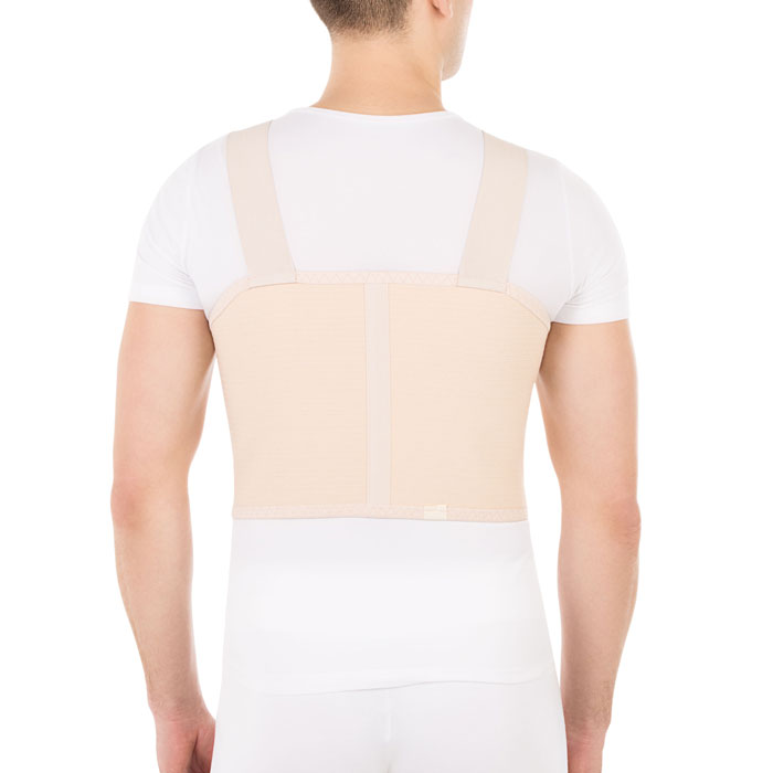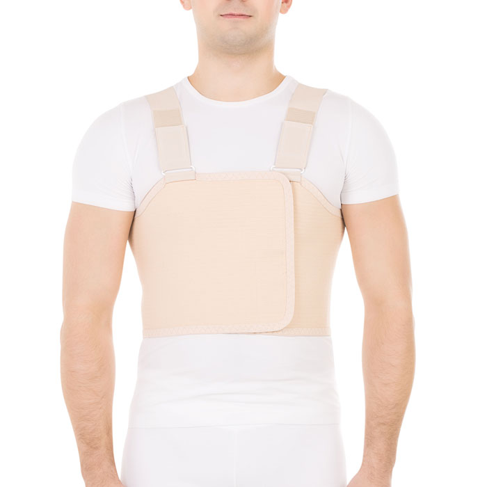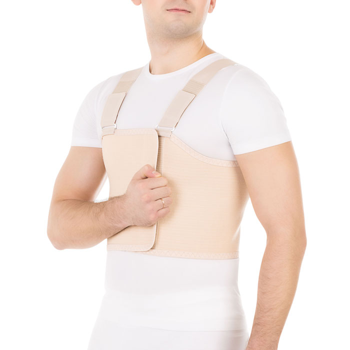 • послеоперационный бандаж имеет анатомическую форму, позволяющую оптимально разместить бандаж на грудной клетке мужчины, снабжен наплечными лямками для надежной фиксации бандажа на грудной клетке